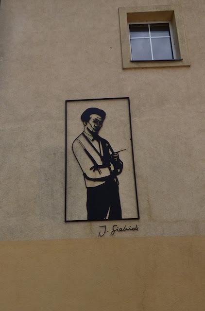 Przechodzimy przez kolejne mostki ozdobione metaloplastyką wskazującą na istniejące dawniej zawody jak kowalstwo, ceramiczny – fabryka ceramiki technicznej, piwowarstwo. Zbliżamy się do centrum miasteczka, na jednej ze ścian zauważam pomysłowe murale. Jest również metaloplastyka upamiętniająca Józefa Gielniaka znanego grafika, który tworzył głównie linoryty. Ze względu na chorobę płuc wiele czasu mieszkał w Kowarach i leczył się. Tutaj również zmarł i został pochowany na miejscowym cmentarzu. Przechodzę już tylko z koleżanką przez centrum i wracamy autobusem do domu.